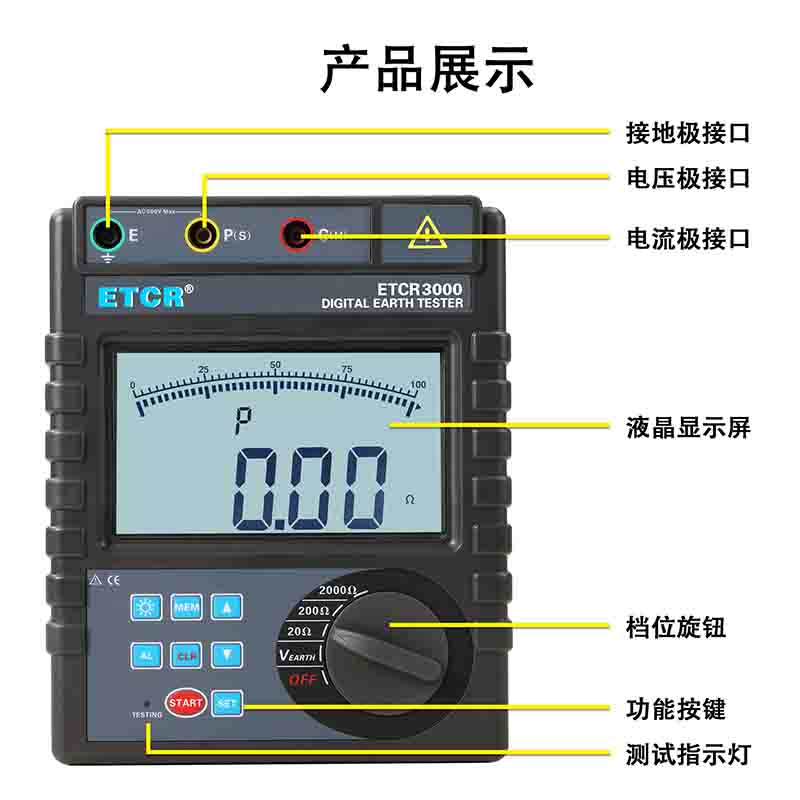 ETCR3000數(shù)字式接地電阻測(cè)試儀又稱接地電阻表、數(shù)字接地電阻表、地樁式接地電阻儀、接地?fù)u表,用于接地電阻測(cè)量、接地電壓測(cè)量,儀表采用數(shù)字及微處理技術(shù),精密3線或簡(jiǎn)易2線法測(cè)量接地電阻,其廣泛應(yīng)用于電力、電信、氣象、建筑、防雷及工業(yè)電氣設(shè)備等行業(yè)。