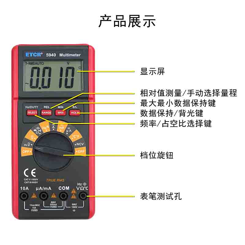 | ETCR5940數(shù)字萬用表 | DC 0mV~1000V AC 0mV~1000V | DC 0.0uA~10A AC 0.0uA~10A | 0.0Ω~60MΩ | 0.0nF~9.999mF | 0.0Hz~20MHz | 0℃~1000℃ |