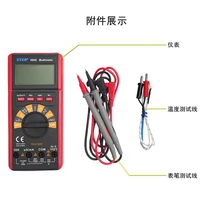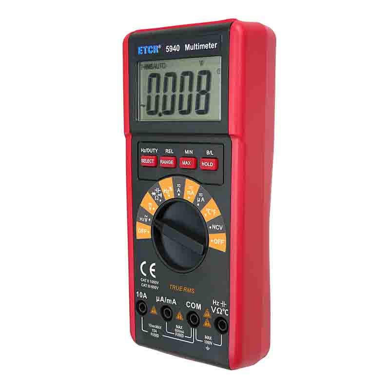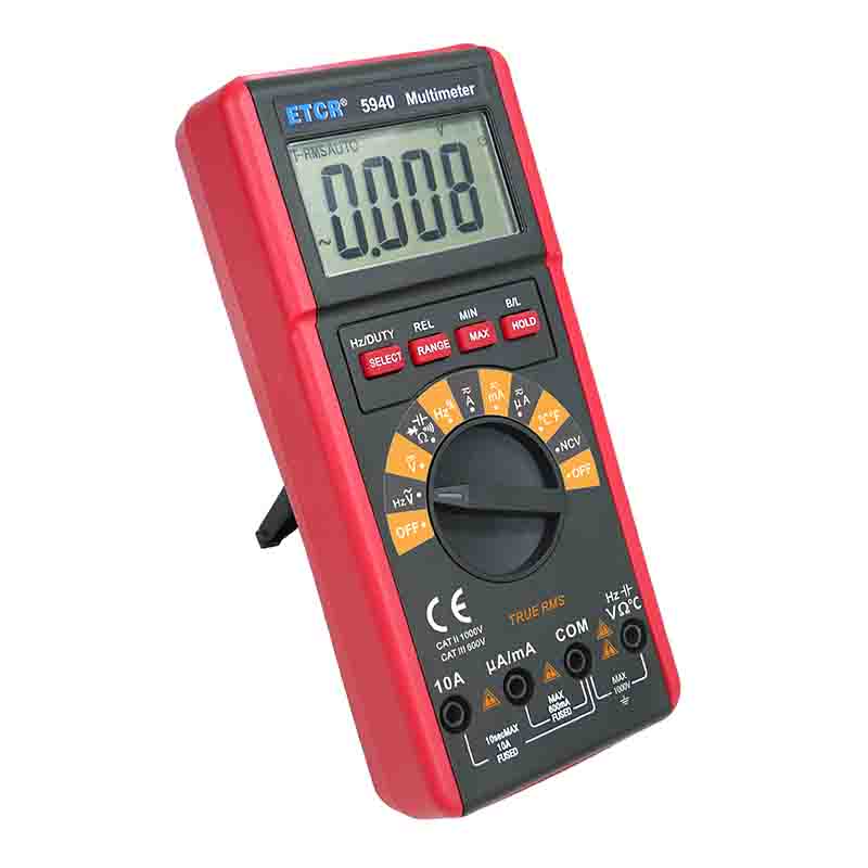 ETCR5940數(shù)字萬用表又稱數(shù)字萬能表、智能萬用表,是一款3 5/6位便攜式自動量程數(shù)字多用表,可測量交流電壓真有效值(TRMS)、直流電壓、交流電流真有效值(TRMS)、直流電流、電阻、頻率、溫度、電容、通斷測試、二極管正向壓降等。該儀表結(jié)構(gòu)精巧、操作容易、攜帶方便,是電工電子測量之理想工具。