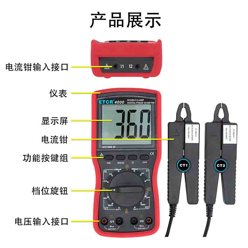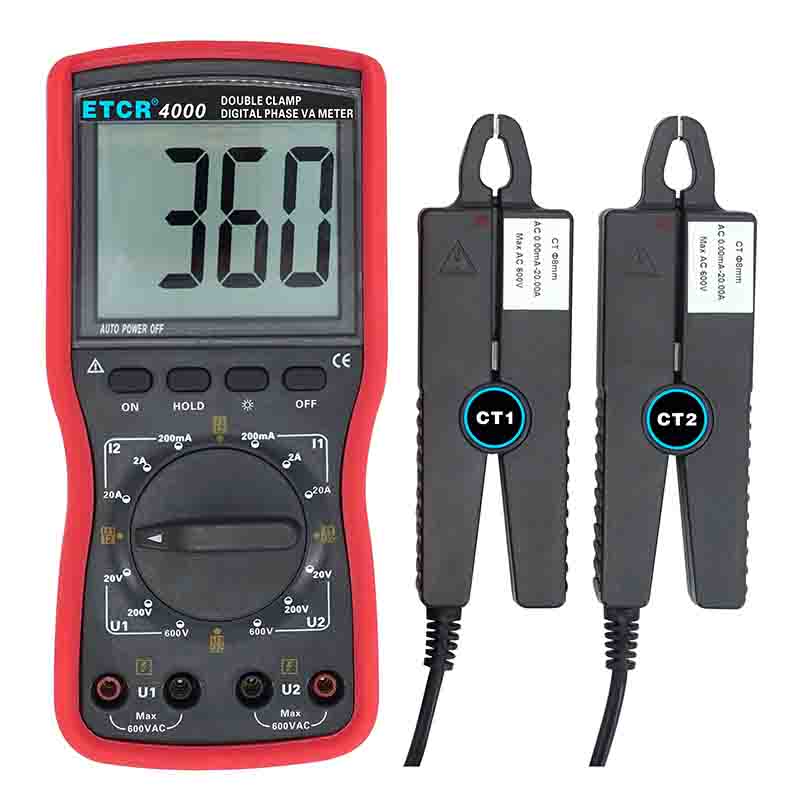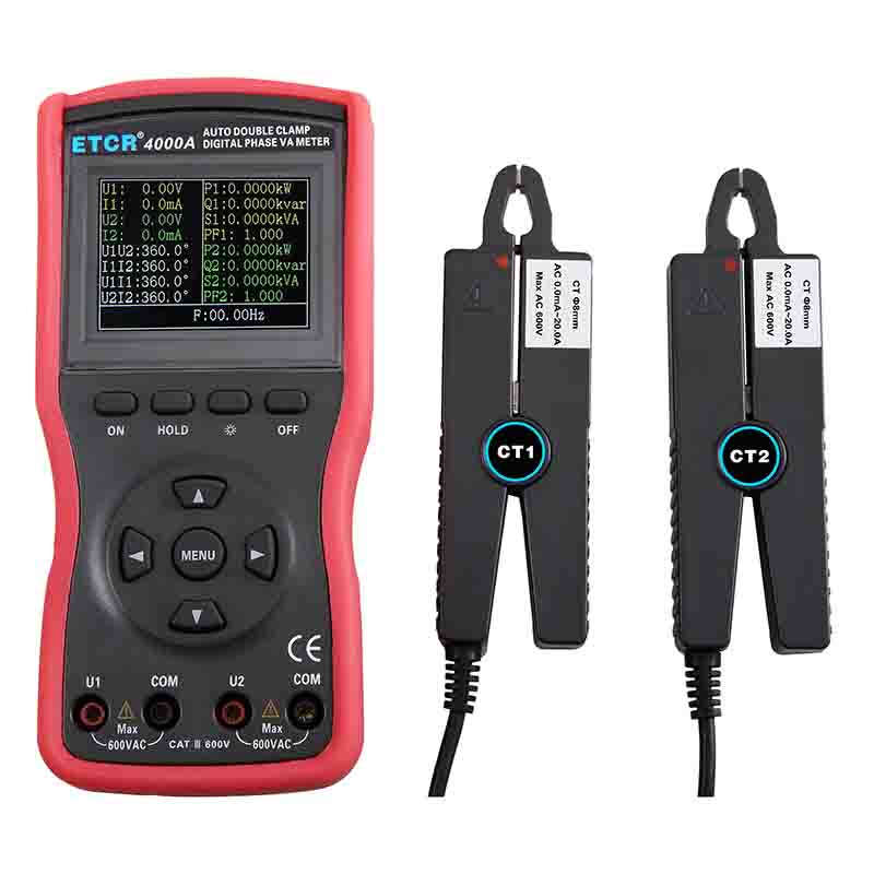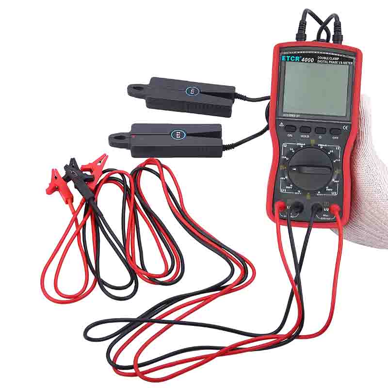 | ETCR4000數(shù)字雙鉗相位伏安表 | Φ8mm | 0~360° | 0.00V~600V | 0.00A~20.0A | -- |