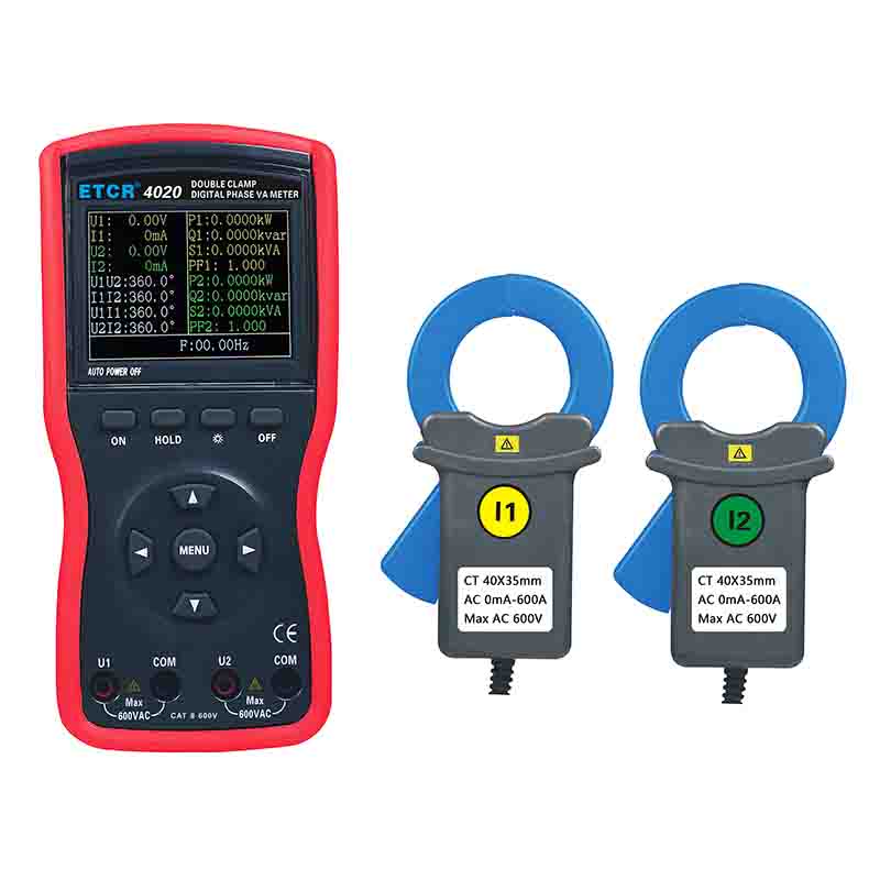 | ETCR4020大口徑雙鉗數(shù)字相位伏安表 | Φ40mm | 0~360° | 0.00V~600V | 0mA~600A | 0.0W~360kW |