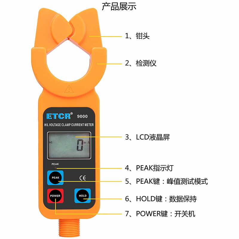 ETCR9000高低壓鉗形電流表鉗頭與引導(dǎo)區(qū)創(chuàng)新的一體化設(shè)計(jì),通過按壓或退拔絕緣桿能快速方便鉗夾或撤離被測導(dǎo)線,安全快捷。儀表還具有峰值保持、數(shù)據(jù)保持、數(shù)據(jù)存儲等功能。
