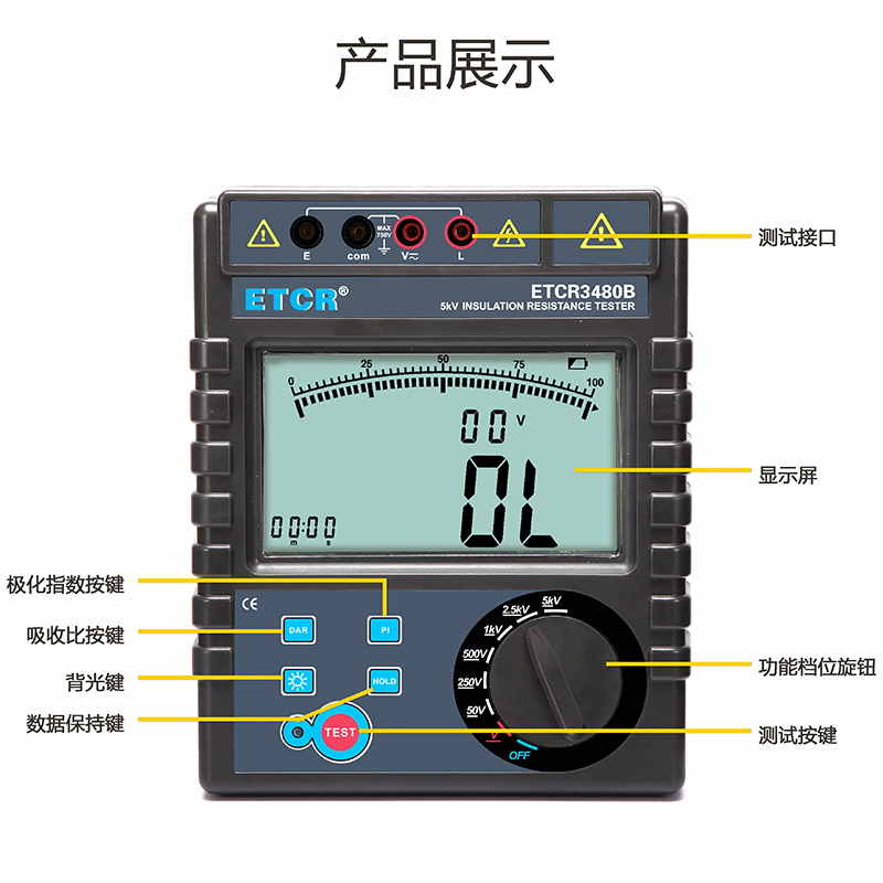 ETCR3480B絕緣電阻表又名兆歐表、絕緣電阻測試儀,用于絕緣電阻測試、吸收比、極化指數(shù)測試、交直流電壓測試。儀表具有LCD大屏幕帶背光顯示、數(shù)據(jù)保持、自動放電、自動關機等功能。儀表具有測試計時,電壓監(jiān)測功能,回路電壓大于36V時,儀表將禁止測試以保護被測物及人員安全。儀表功能操作簡易,絕緣電阻值,測試時間,輸出電壓同屏顯示,具備交流電壓、直流電壓測試功能。