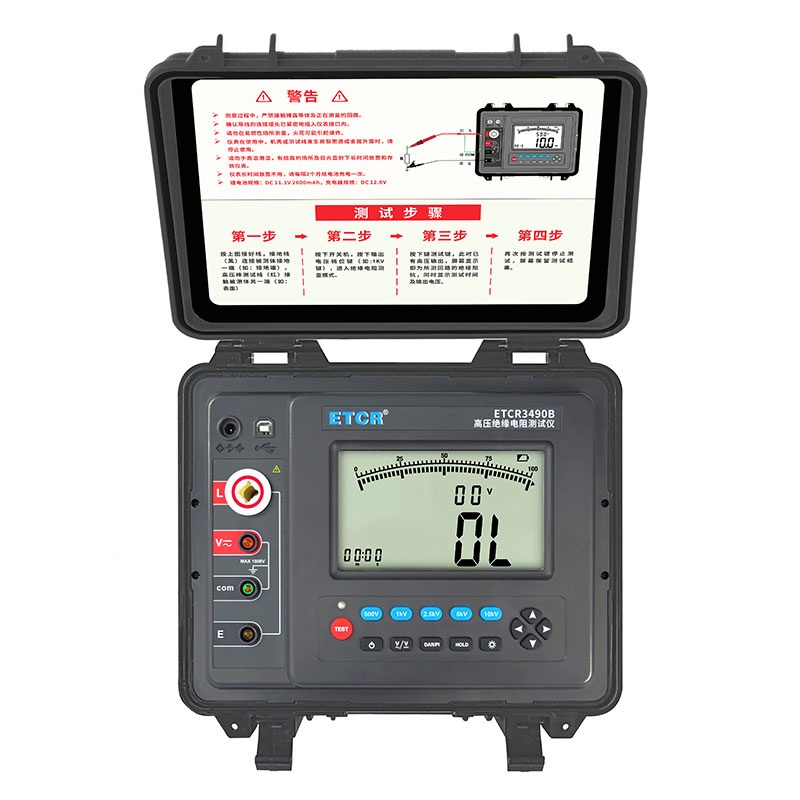 ETCR3490系列高壓絕緣電阻測試儀又名兆歐表、絕緣電阻測試儀等,用于絕緣電阻的測試。本儀表是一款高性能數(shù)字式儀表,具有LCD大屏幕帶背光顯示、數(shù)據(jù)保持、自動放電、自動關(guān)機(jī)等功能。儀表具有測試計(jì)時,電壓監(jiān)測功能,回路電壓大于36V時,儀表將禁止測試以保護(hù)被測物及人員安全。儀表功能操作簡易,絕緣電阻值,測試時間,輸出電壓同屏顯示,同時還具備吸收比、極化指數(shù)測試、交流電壓、直流電壓測試功能。