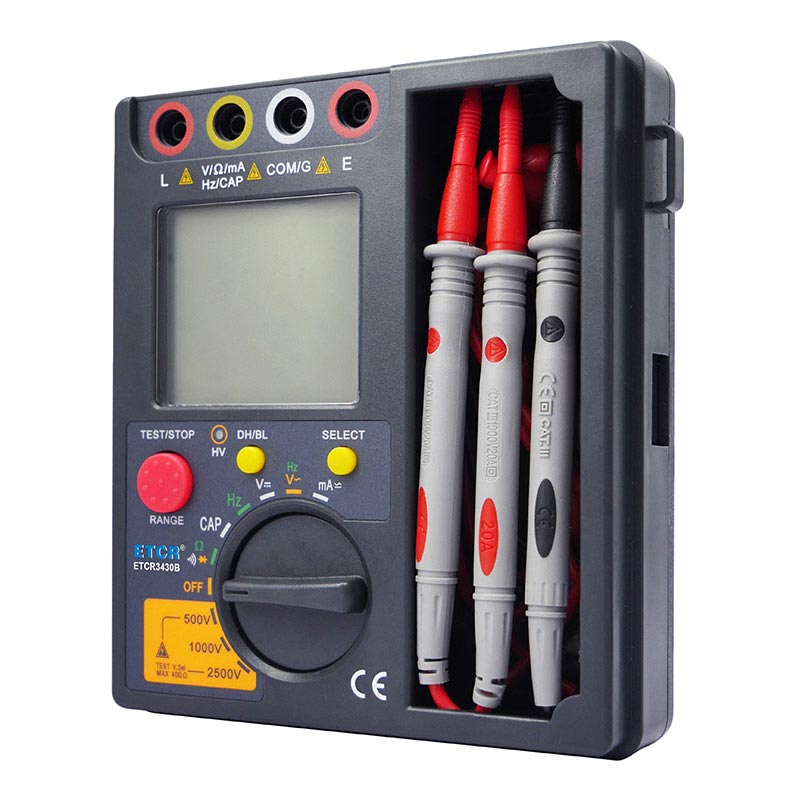 | ETCR3430B高壓絕緣電阻萬(wàn)用表 | 500V/1000V/2500V | 0.5MΩ~50GΩ | 1mA MAX | DC:0V~1000V | AC:0V~700V | 0nF~40mF |