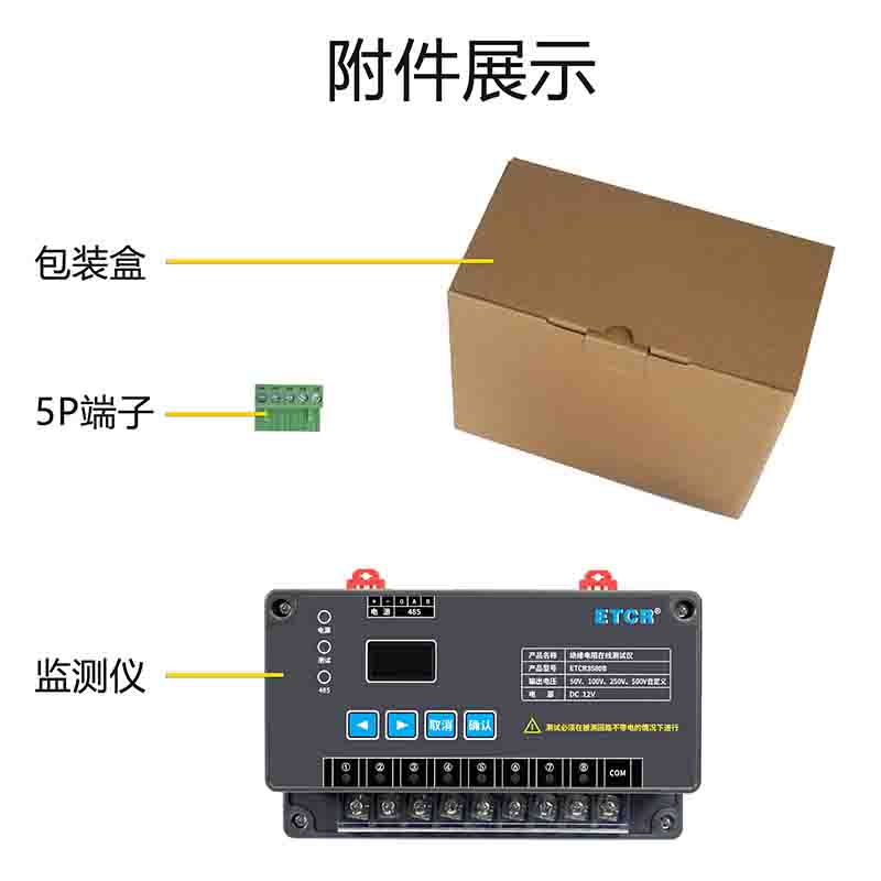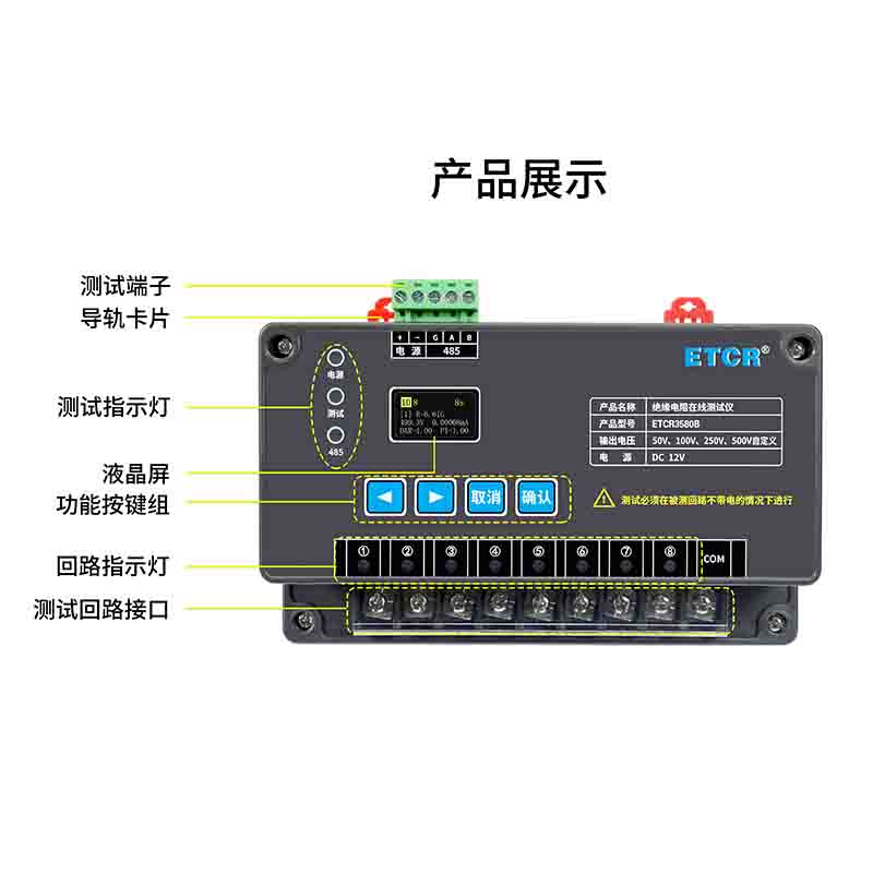 | ETCR3580C絕緣電阻在線監(jiān)測儀 | 50V、100V、250V、500V、1000V、自定義 | 0.1MΩ~20GΩ | 5mA MAX | 1路 | RS485 |
