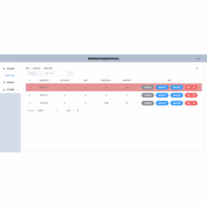 4、監(jiān)測儀管理功能:通過賬號來高效管理監(jiān)測儀,隨時更改簡要地址與安裝地點,使得每次監(jiān)測都能夠保證漏電事件發(fā)生時準確的定位??刹榭吹劫~號所綁定的監(jiān)測儀臺數(shù),并自動歸類監(jiān)測儀類型,和該賬號最大綁定儀器數(shù)目等信息。