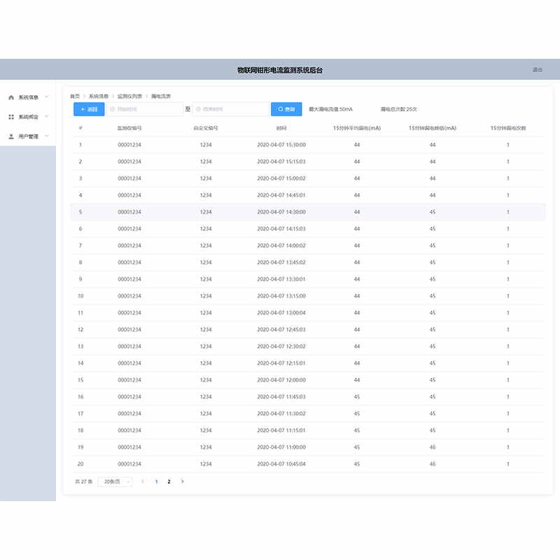 1、數(shù)據(jù)統(tǒng)計功能:系統(tǒng)對上傳數(shù)據(jù)進行統(tǒng)計,實現(xiàn)表格與折線圖兩種查看方式,實時監(jiān)測并顯示最大電流值與漏電次數(shù),便捷高效實用。在PC終端可通過時間按鍵快速查詢,該時間內(nèi)的所有監(jiān)測數(shù)據(jù)并以表格或折線圖兩種方式之一顯示出來。