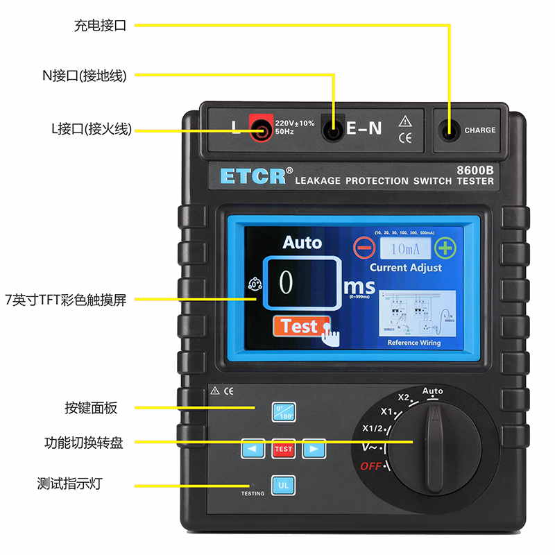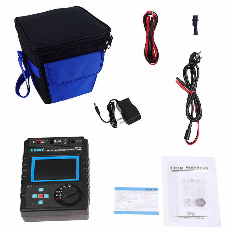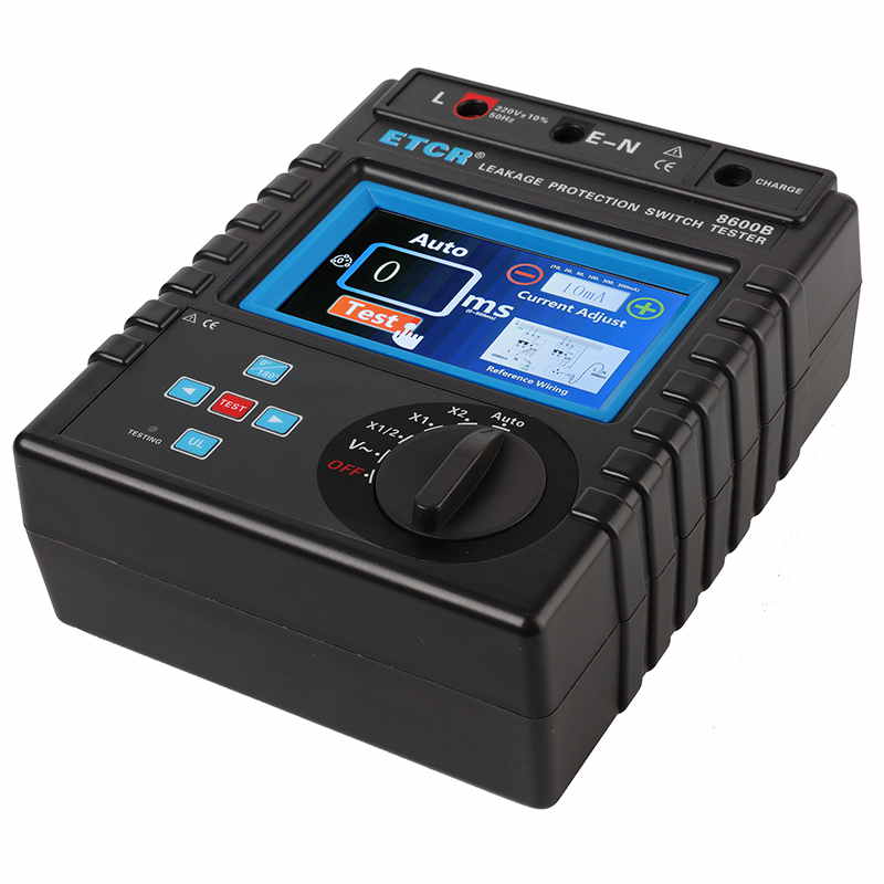 | ETCR8600B漏電保護器測試儀 | 5mA~1000mA,十六檔 | 0ms~999ms | AC 0~600V | 觸摸彩屏 | 鋰電池 |