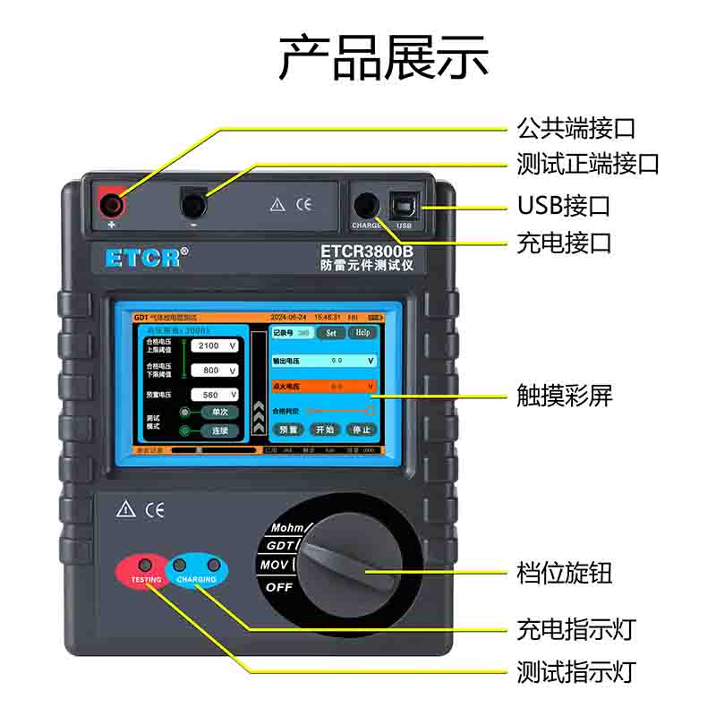 用于壓敏電阻(MOV)、放電管(GDT)、浪涌保護器(SPD)等防雷元件性能參數(shù)的測試及絕緣電阻(Mohm)、極化指數(shù)(PI)、吸收比(DAR)測試