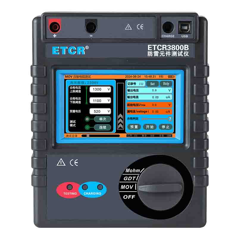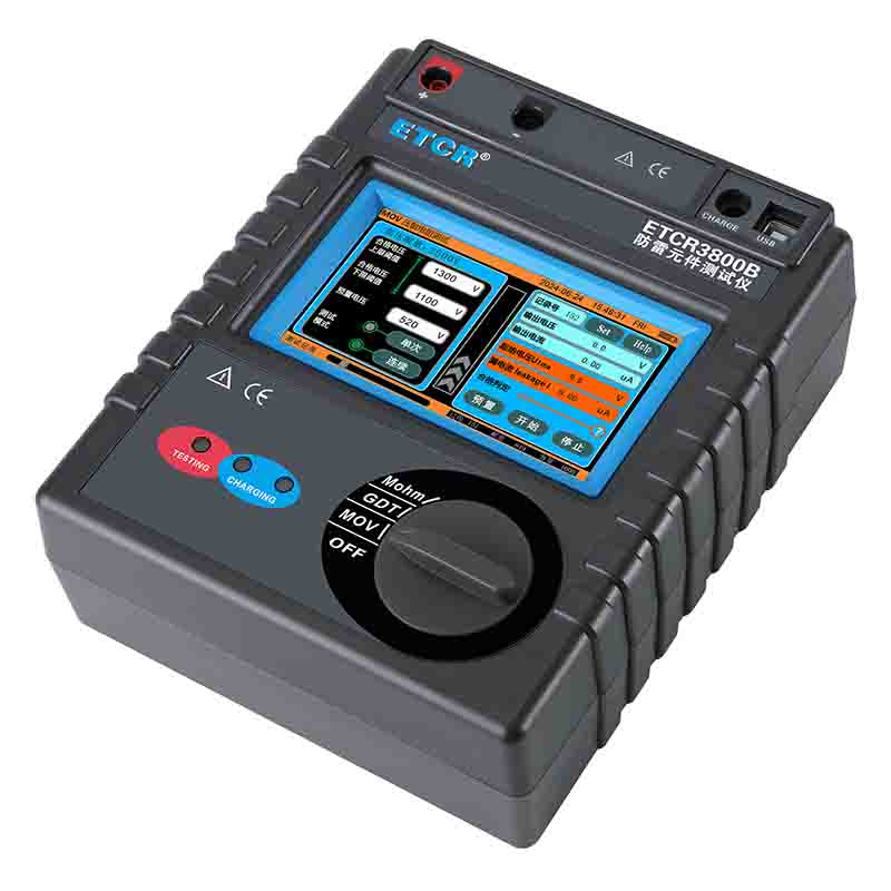 ETCR3800B智能型防雷元件測試儀又稱防雷元件測試表、SPD現(xiàn)場測試儀、壓敏電阻測試儀、浪涌保護器測試儀,用于測量各種壓敏電阻(MOV)、氣體放電管(GDT)、浪涌保護器(SPD)性能參數(shù)測試,還具有絕緣電阻、吸收比、極化指數(shù)測試功能。儀表具有獨特的高壓短路保護、過流保護功能,專業(yè)級的參數(shù)設(shè)置功能、高壓限值設(shè)定、升壓速度設(shè)定、合格范圍設(shè)定、合格判斷篩選、自動量程調(diào)節(jié)等功能。還具有單件測試模式、連續(xù)測試模式功能,特別適合批量元件測試。儀器廣泛用于避雷器、防雷器、浪涌保護器、壓敏電阻、金屬陶瓷放電管、真空避雷管等過壓防護元件性能參數(shù)的測試。是氣象防雷、電力、通信、機電安裝和維修、防雷元件生產(chǎn)廠家、以及工業(yè)企業(yè)部門常用必備的儀表。