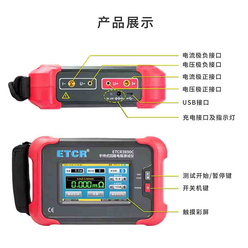 ETCR3690C手持式回路電阻測(cè)試儀根據(jù)人體工程學(xué)原理設(shè)計(jì),手感舒適,特殊設(shè)計(jì)的機(jī)體結(jié)構(gòu)具有絕緣、封閉,防漏電、防風(fēng)沙,減震防護(hù)等功能。儀表采用高亮度5寸觸摸彩屏,操作簡易快速功能直達(dá),字符清晰明亮,中英文顯示界面。儀表有多檔測(cè)試電流可選,儀表顯示當(dāng)前檔位的測(cè)試范圍,用戶可自行選擇電流檔位及測(cè)試時(shí)間,滿足用戶不同場(chǎng)合的要求。