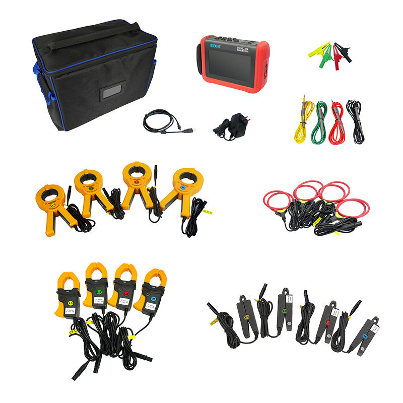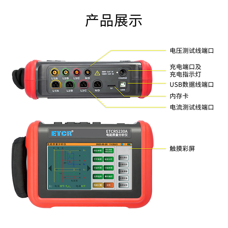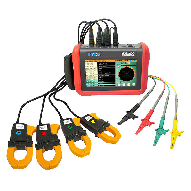 ETCR5230A電能質(zhì)量分析儀是我公司精心研制的一款專為現(xiàn)場測試三相電能質(zhì)量的高精度綜合型測試儀器。儀表具有智能化、功能完善、人機操作簡潔、中英文雙語操作界面等特點。儀表采用7寸觸摸彩屏、體積小重量輕、攜帶方便,可選配多款電流鉗。儀表可同時測量4路電流(ABC三相及中性線電流),3路電壓、三相不平衡度、有功功率、無功功率、視在功率、諧波比、總諧波失真度等;顯示電流電壓的實時波形、相量圖;動態(tài)捕捉電壓電流瞬時變化,監(jiān)測啟動電流,監(jiān)測各電力參數(shù)并生成告警列表,長時間記錄測試數(shù)據(jù)并生成趨勢曲線圖等功能。