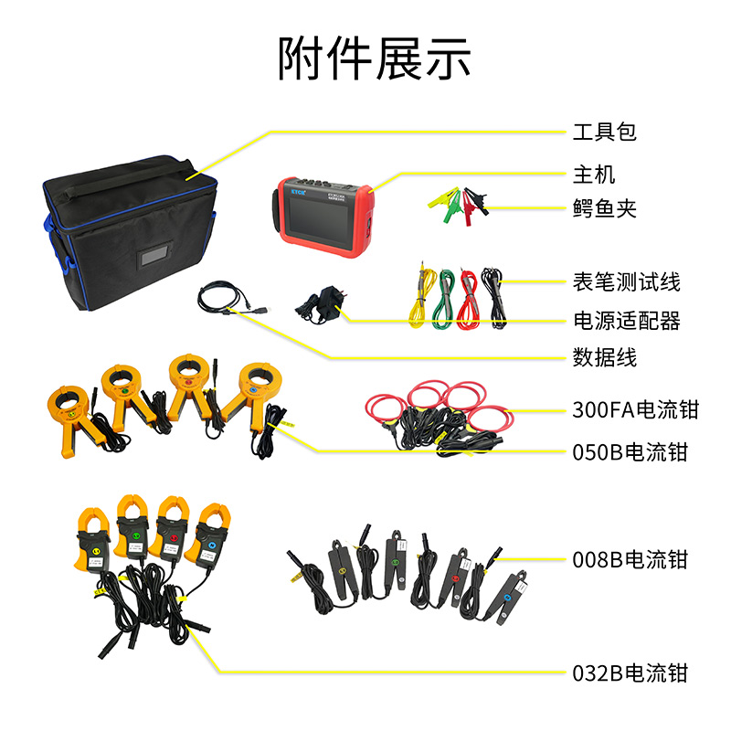 鉗口尺寸 | 008B電流鉗:Φ8mm;(選配) 032B電流鉗:32mm×40mm;(選配) 050B電流鉗:Φ50mm;(選配) 300FA電流鉗:Φ300mm;(選配) |