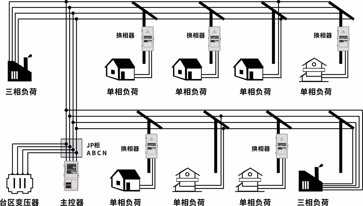 治理一個(gè)臺(tái)區(qū)需根據(jù)臺(tái)區(qū)變壓器容量及不平衡的嚴(yán)重程度,配置一臺(tái)主控器及若干臺(tái)換相開關(guān)。換相開關(guān)接收主控器發(fā)出的指令將單相負(fù)荷在三相之間切換,切換過(guò)程不中斷供電,不會(huì)影響用戶用電。從而有效解決配網(wǎng)中三相負(fù)荷不平衡問(wèn)題。