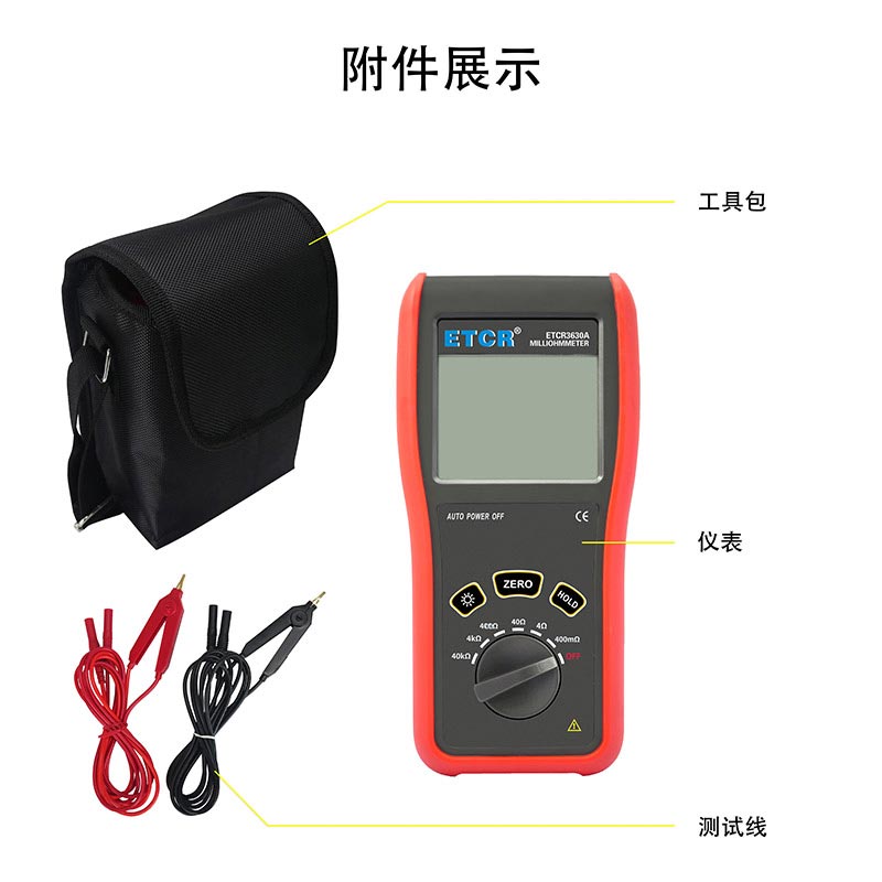 ETCR3630A便攜式毫歐計又稱直流低電阻計、直流電阻測試儀,歐姆計,儀表采用微處理機技術,四線法測試,安全精密可靠。主要用于測量電纜的導線電阻,開關、接插件、繼電器的接觸電阻,線圈、電動機、變壓器繞組的直流低電阻,金屬鉚接件金屬構件之間,地網(wǎng)地極連接導體間的聯(lián)接電阻。儀表廣泛應用于工礦企業(yè)、建筑監(jiān)測監(jiān)理公司、建筑施工單位、防雷公司、電力部門、船舶機車廠等。ETCR3630A便攜式毫歐計由主機、測試線組成。主機大屏LCD顯示,一目了然。能存儲1000組數(shù)據(jù),電阻測量范圍:0.1mΩ~40.0kΩ,最大測試電流:100mA,儀表操作簡易,攜帶方便。