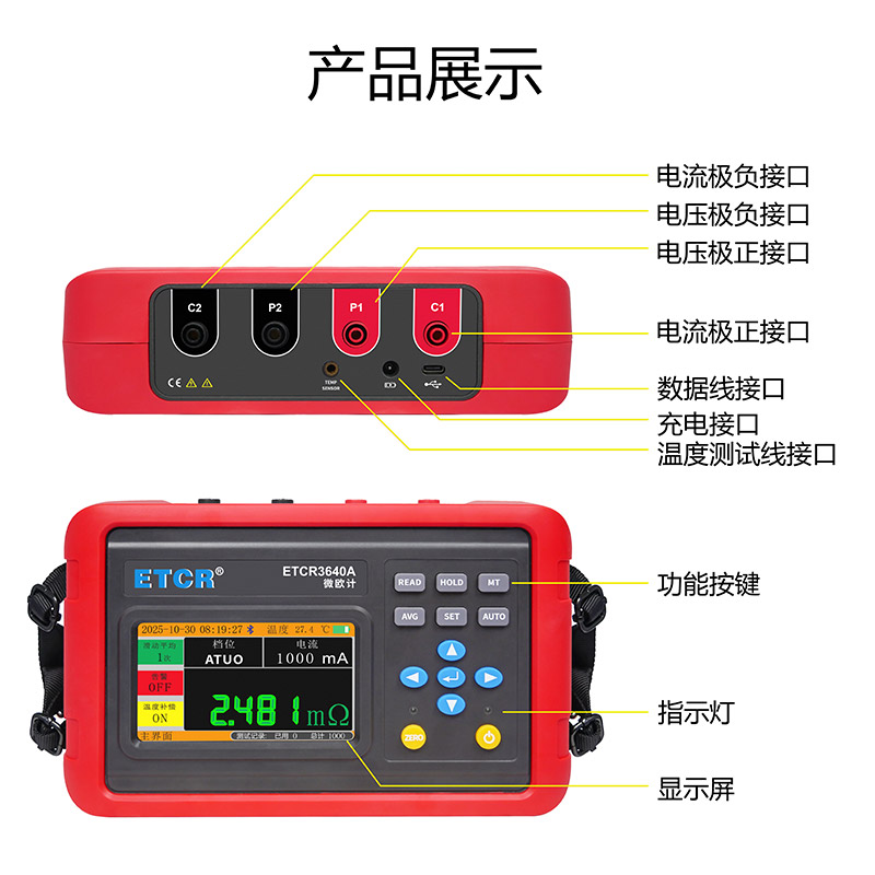 1、最大測(cè)試電流1A,寬量程:1.0uΩ~40kΩ,高分辨率0.1uΩ。