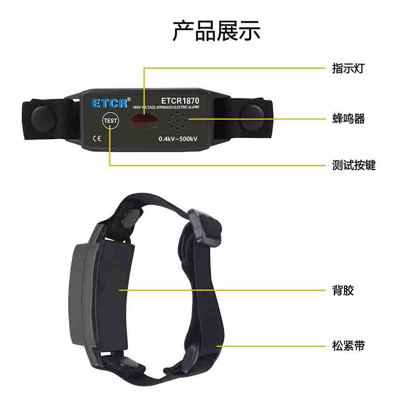ETCR1870手臂式近電報警器又稱穿戴式近電報警器,為近電作業(yè)人員提供一款安全、實用、便捷的新型高壓報警裝置。帶電作業(yè)時,操作人員與帶電體的安全距離不能低于相關工作規(guī)程的要求。作業(yè)人員佩戴本報警器后,在接近高壓帶電體一定距離時,根據(jù)電壓等級相應的安全距離,報警器發(fā)出聲光報警,提醒電氣工作人員注意安全,避免發(fā)生高壓觸電事故。