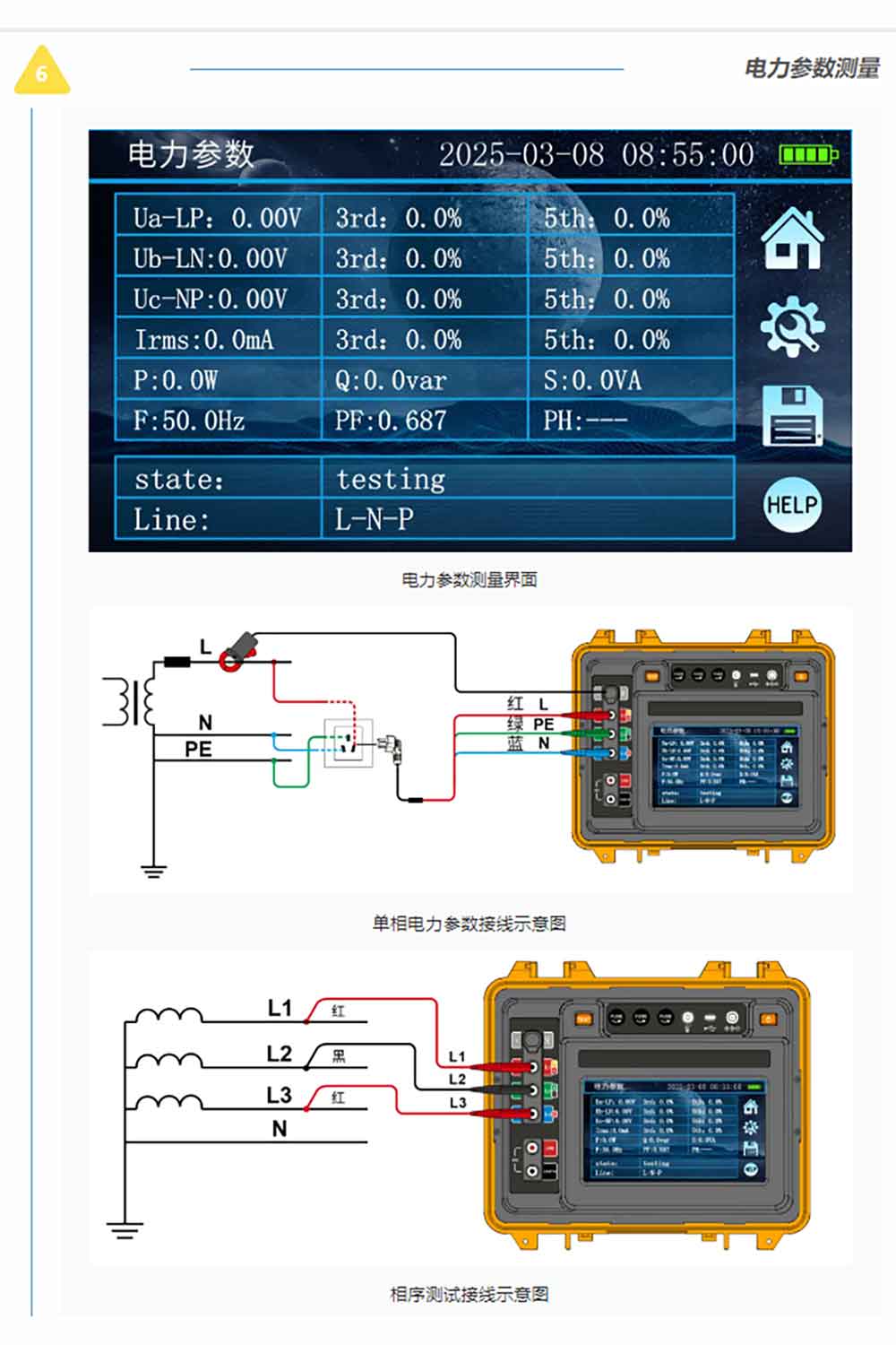 接地/絕緣/直流電阻測試、RCD漏電保護檢測、電氣插座檢測、電流有效值測試、交流電壓測試、相序測試等電力參數(shù)測試。